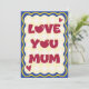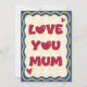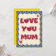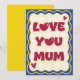 A bold and cheerful greeting card featuring the message “LOVE YOU MUM” in playful red lettering, set against a soft patterned background and framed with a vibrant blue and yellow decorative border. Small heart accents add a warm and loving touch, making this design perfect for expressing love and appreciation for Mom.