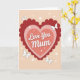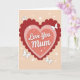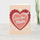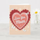 This greeting card shows a layered heart design centered on a soft peach background. A deep crimson outer heart with a scalloped edge frames a rose-pink heart, and inside that sits a coral heart. In the middle, the words “Love You Mum” appear in white cursive lettering, placed right at the center, with a slight shadow that helps it stand out. Four small white butterflies float around the heart, their wings open as if they’re gently circling it. Faint white and pale pink dots are scattered in the background like light confetti, adding a calm, happy feel without being too much. The warm reds and pinks make it feel caring and close, like a simple thank-you for steady love and support. It’s an easy card to give when you want to say “I care about you” in a way that feels honest 🥰❤️. Wishing you a lovely time sharing Valentine’s Day feelings with the people you love.