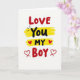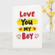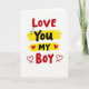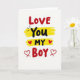 This card features the message “LOVE You MY BOY” stacked down the center on a white background, with a few red hearts scattered around it ❤️. The letters look hand-drawn and a bit uneven in a charming way, mixing red, black, and yellow for a strong contrast. “You” and “MY” stand out with rough yellow brush marks behind them, like quick highlights added with paint. Small dash marks near “You” add a little burst of energy, as if the words are being said out loud with feeling. The hearts include both filled-in red shapes and simple red outlines, which keeps the design sweet and easy to read. The message feels meaningful because it’s direct and affectionate, like a note you’d write when you really want someone to feel loved 🥰. It works well for a partner, a close friend, or someone you care about deeply, especially if you like simple words that hit home. Hope it helps you share your Valentine’s Day sentiments.