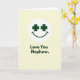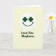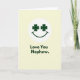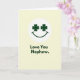 This card features a large white circle centered on a soft creamy yellow-green background, like a gentle spotlight on the main image. Inside the circle, a deep forest-green smiling face looks straight ahead, and its eyes are replaced by two matching four-leaf shamrocks ☘️. That little swap makes the face feel like it’s smiling right at a nephew with an easy, affectionate closeness, as if sharing a private joke. Below the circle, the text “Love You Nephew.” sits neatly centered in the same deep green, using simple sans-serif lettering that’s easy to read. The spacing between the graphic and the words keeps everything relaxed and uncluttered, letting the message land without crowding the design. The limited palette of green on the pale background keeps the mood calm while still feeling festive, with a small pop of St. Patrick’s Day energy 💚. The shamrock eyes are evenly sized and symmetrically placed, forming the most noticeable detail within the forest-green face.