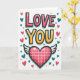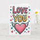 This greeting card features the big words “LOVE YOU” front and center, set against a white background. “LOVE” is in bright pink and “YOU” is in golden yellow, and both words have black outlines with a teal shadow that makes them stand out. Below the words sits a large pink heart with a light grid pattern across it, and small white wings spread out from each side. A few smaller hearts float around the main design in red and teal, like little pieces of confetti. The overall look feels happy, sweet, and full of affection, without being too busy. It’s an easy card to give to a partner, close friend, or anyone you care about 💘❤️.