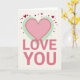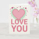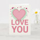 This greeting card shows a large layered heart taking up the upper half of the front. The heart has a solid pink center, a scalloped dark pink edge, and an outer ring with mint green stripes. Around it, several small dark pink hearts float outward like little bursts of love 💘. The background is filled with soft pastel polka dots that give the scene a calm, cozy feel. Near the bottom, the words “LOVE YOU” appear in plain, thick pink letters that are easy to read. The simple colors and sweet shapes make it feel caring and cheerful ❤️.