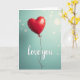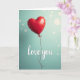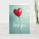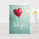 This greeting card shows a single red heart-shaped balloon floating against a soft teal background. The balloon looks shiny, with light reflecting off its curved surface and giving it a smooth, full shape. It sits a bit above the middle of the card, like it’s gently drifting upward. A thin dark red string hangs down from the knot and curls slightly as it reaches toward the bottom. Near the lower part of the card, the words “love you” appear in white cursive-style lettering, simple and easy to read. Faint light circles in the background add a calm, dreamy feel without taking attention away from the heart. The strong red heart against the cool teal color makes the message feel warm and loving