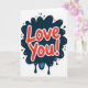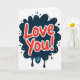 This greeting card puts the words “Love You!” right in the center in big, rounded red letters with small light spots that make them look shiny. A bright white outline traces each letter, helping the message stand out clearly. The text sits on top of a dark navy blue shape that looks like a splash of ink. The edges are uneven, and the bottom drips downward like paint, with small touches of aqua mixed in. A thin white line also outlines the blue splash, and everything sits on a plain white background. The strong red, deep blue, and white contrast makes the card feel direct, happy, and full of affection 💘❤️. Share it with someone special and let them know you’re thinking of them this Valentine’s Day 😘.