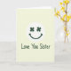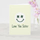 This card features a pale pistachio green background that feels calm and inviting, with a crisp white circle placed near the top center. Inside the circle, a simple smiling face looks back at you, and its eyes are two dark emerald four-leaf clovers that add a lucky touch ☘️. The curved smile below them is drawn in the same deep green, giving the face a friendly, affectionate look, like it’s smiling straight at a sister it adores 💚. Beneath the circle, the words “Love You Sister” sit in the lower half of the card, written in a flowing, casual hand. The text is also deep green, matching the clover eyes and tying the design together without adding extra clutter. Plenty of open space surrounds the emblem and message, letting the gentle green and white contrast do most of the work. The upper circle stays centered and bright against the soft background, with the green clovers and smile standing out clearly inside it.