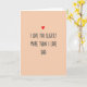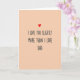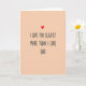 This card features a warm peach background with a simple, centered message that makes people smile. The text reads “I LOVE YOU SLIGHTLY MORE THAN I LOVE DAD” in a casual, hand-drawn sans‑serif style, all in dark lettering. A small red heart sits above the words near the top center, like a sweet little highlight ❤️. The layout is uncluttered, so your eyes go straight to the joke and the affection behind it. It feels meaningful because it mixes real love with an honest, teasing line that many couples or close friends will recognize. The soft colors and slightly uneven letter shapes make it feel more human and less formal, like something you’d actually say out loud 🥰.