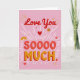 This greeting card features big, cheerful lettering that fills the tall front panel and makes the message the main focus. “Love You” is written near the top in dark red, hand-drawn cursive with a thin white outline. Below it, “SOOOOO MUCH” appears in chunky orange letters with a strong red shadow, giving the words a lifted look. The background is bright pink, with white and gold rays spreading out from behind the text like a burst of happy energy. Small red hearts are scattered around, along with a little gold sunburst and a curved rainbow that adds a sweet, friendly touch. In the bottom right corner, there’s a tiny strawberry, which feels like a cute extra detail for someone you adore 🥰. It’s a simple way to say a lot, whether you’re feeling romantic or just really grateful for someone ❤️, and it’s perfect for sharing Valentine’s Day feelings with someone you care about.