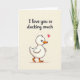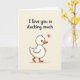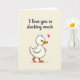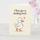 This card features a fluffy white baby duck near the bottom, drawn with soft rounded lines that make it look cuddly and a little bashful ❤️. Its small dark eyes and bright orange beak and webbed feet stand out against its pale feathers, as if it’s leaning forward to offer affection. A pink heart floats just above its head, adding a sweet, flirty cue like it’s sending a tiny love note. The background stays a smooth, creamy beige, keeping the focus on the duck and the message. Across the upper half, the phrase “I love you so ducking much” is written in a flowing dark gray cursive-style font, with the words centered and easy to read. The gentle spacing between the text and the duck leaves some breathing room, like a quiet pause before a hug 🌼. The duck sits in the lower portion of the design with the pink heart hovering above its head.