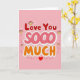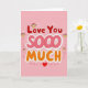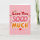 This greeting card centers on the message “Love You SOOO MUCH” stacked in four lines on a soft pink background. “Love You” sits at the top in red, and the “o” is replaced with a small white heart that makes the words feel extra sweet ❤️. Under that, “SOOO” appears in a lighter pink with rounded letters and long “o”s that stretch out the feeling. “MUCH” is placed at the bottom in warm orange, giving the message a steady, grounded finish. Around the words, small rainbow shapes in brown, blue, and yellow sit near the corners and edges like little accents. Tiny white dots float around the text, and short red dash marks point outward from a red heart below “MUCH,” like love is spreading in all directions 🥰. It feels meaningful to give because it says a lot in a simple way, and the hearts and soft colors keep it warm and caring. Share it to pass along your Valentine’s Day feelings to someone you love.
