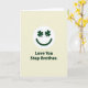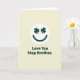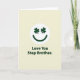 This card shows a pale, creamy beige background with a large white circle centered like a simple badge. Inside the circle, a smiling face looks straight out with two deep emerald green shamrocks for eyes, giving it a lucky, affectionate look ☘️. A thick green curved line forms the mouth, and the smooth shapes make the face feel calm and friendly, like a quiet inside joke between close family. Just below the circle, the message “Love You Step Brother” appears in a strong sans-serif style, set in the same dark green as the shamrocks. The text is centered and sits with comfortable spacing under the face, so the words feel closely tied to the grin above 💚. The limited palette—beige, white, and rich green—keeps the focus on the tender expression created by the shamrock eyes and the steady smile. The overall layout leaves plenty of open space around the central emblem and the green lettering, with crisp edges and flat color throughout.