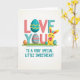 Designed with a bright digital illustration style, this card centers on the big words “LOVE YOU” in chunky, three-dimensional letters that feel like they’re leaning toward each other in a friendly, romantic way 🌷. The “L” and “V” are soft coral-pink, while the “Y” and “U” are teal, creating a pleasing back-and-forth of color across the middle. Each “O” is an oval design: the one in “LOVE” is turquoise with golden wavy lines, and the one in “YOU” is lighter teal with thin pink stripes. The lettering sits on a strip of bright green grass dotted with small patterned eggs, adding a springtime scene without crowding the message. On the right side, a small long-eared yellow bunny-like creature 🐰 sits with a gentle tilt, holding a purple heart close as if saving it for someone special. Beneath the main words, a smaller line of text reads “TO A VERY SPECIAL LITTLE SWEETHEART” in teal, placed near the bottom and spaced neatly under the grass. The background fades softly from white to a creamy off-white, keeping the pinks, teals, yellow, purple, and green as the main focus. The purple heart is centered between the creature’s paws, with the long ears pointing upward against the pale gradient backdrop.