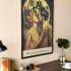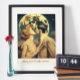 Vintage travel poster of a romantic couple kissing near a lake with the moon in the background