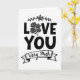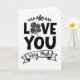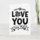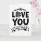 This greeting card features a white background with the large words “LOVE YOU” in thick black letters centered on the front ❤️. Above the words, black roses and leafy stems form a small garland that curves across the top. Four roses are tucked inside the “O” in “LOVE,” which makes the message feel extra caring and thoughtful. Under “LOVE YOU,” the words “Very Much” appear in a flowing, cursive-style black lettering. That smaller line sits inside a black ribbon banner with light shading lines that give it a sketched look. The strong main text and the softer flowers work well together, like saying something direct while still being gentle 🥰. It’s a meaningful card to give when you want someone to feel clearly loved without needing a lot of extra words. Hope it helps you share Valentine’s Day feelings in a simple, heartfelt way.