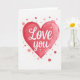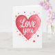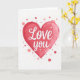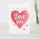 This card shows a large red heart painted in a watercolor style, with darker and lighter areas that fade softly at the edges. Inside the heart, the words “Love you” sit right in the center in white flowing handwriting, standing out clearly against the red. Two small white hearts appear within the bigger heart, adding a sweet little detail. Around the heart, there are scattered paint splashes in deep red and light pink that look like quick drops and soft washes. The background is plain white, which makes the heart and splatters feel even more noticeable. Overall, it feels romantic, simple, and full of affection 💘❤️.