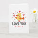 This card shows a cute, stylized yellow bird standing inside a soft white circle, like a gentle halo around it. The bird has a plump lemon-yellow body, one big black eye, and a small pink blush on its cheek that makes it look a little shy 🥰. Its tiny red beak and orange wings and tail add warmth, and two simple red feet sit underneath like little crosses. All around the bird, small hearts float in the background, in shades from deep red to light pink, giving the scene a sweet, loving feel ❤️. The background is plain white, which keeps everything easy to see and puts the focus on the bird and the hearts. Near the bottom, the words “LOVE YOU” appear in dark gray, simple printed letters, centered under the picture. It feels meaningful to give because it’s straightforward and tender, like a small way to say “I’m thinking of you” without needing a lot of extra words. Hope it helps you share your Valentine’s Day feelings in a kind, honest way.