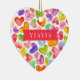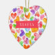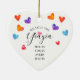 Yiayia Christmas ornament design featuring a field of colorful watercolor hearts. The back of our ornament can be personalized with grandchildren names.