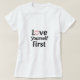 Celebrate the importance of self-love with this chic t-shirt. The phrase "Love Yourself First" is beautifully displayed in a minimalist serif font with subtle heart accents, perfect for women who prioritize their happiness.
