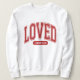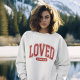 Celebrate the greatest love you've ever known this Valentine's Day with this eye-catching women's white collegiate style sweatshirt displaying the word "LOVED" in bold red varsity lettering along with the scripture reference 1 John 4:19 which serves as a heartwarming reminder that we are able to love God only because He first loved us through gifting His Son Jesus as our Redeemer.