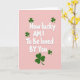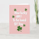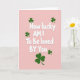 This card features the centered message “How lucky AM I To Be loved BY You” in rounded white lettering with a soft shadow that makes it stand out. The words fill most of the front, with line breaks that keep the phrase stacked neatly in the middle. A smooth rose-pink background sets a tender, close feeling, like a quiet moment shared between two people who feel safe with each other. Dark emerald shamrocks are scattered around the text, giving the layout a lucky St. Patrick’s Day touch ☘️. Their deep green color adds contrast against the pink, and the leaves appear in different spots like they’re gently framing the message rather than crowding it. The mix of affectionate wording and lucky symbols reads like a sweet nod between friends or partners who know they’re better together 💚. Several three-leaf clovers sit near the corners and along the sides, leaving the center open so the white text remains the main focus.