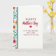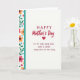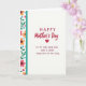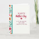 This card features the large text “HAPPY Mother’s Day” near the top in bright red, with rounded, flowing lettering that stands out right away. Just below it sits a red heart ❤️, centered like a quiet promise between partners. Under the heart, a longer message reads “TO MY VERY DEAR WIFE WHO IS LOVED EVERY DAY OF THE YEAR” in a darker red, placed in neat lines across the middle-lower area. The background is plain white, letting the red lettering and heart feel even more intimate, like a note left where she’ll find it. Along the left edge runs a vertical strip of stylized flowers in pink and warm orange with deep-colored centers, mixed with green leaves that curl gently upward. Tiny blue and red heart shapes are tucked among the leaves 🌼, adding small romantic accents without crowding the design. A slim teal band with a lightly textured look separates the floral border from the open white space on the right.