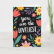 This greeting card features the phrase “you are the LOVELIEST” centered in bright white on a deep black background, with “you are the” set above “LOVELIEST” in smaller lettering. Around the edges, a rich floral frame wraps the message like a close hug between friends, with coral tulips, golden-yellow sunflowers with orange-red centers, and soft pink blossoms leaning inward. Teal leaves and slender lavender sprigs weave between the flowers, giving the border a gentle, intertwined look that feels like two people quietly reaching for each other. Scattered polka dots in white, yellow, red, and blue float across the black space like confetti, adding a light, celebratory sparkle 💚. The contrast makes every petal look luminous, as if the flowers are glowing against the dark. The white text stays crisp and easy to read, with “LOVELIEST” larger and anchored in the middle while the smaller line sits just above it. A few tiny dots cluster near the corners, and the blooms curve toward the center beside little hints of ☘️ green leaves.