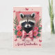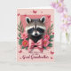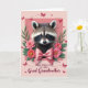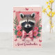 Designed with a soft blush background, this card centers on a fluffy-faced nocturnal mammal gazing forward with dark, glossy eyes that feel tender and attentive, like it’s quietly sharing affection ❤️. Its brown, black, and white fur is framed inside a pale pink rectangular inset, with mask-like markings giving the face a gentle, expressive focus. A velvety pink rose opens along the left side, while bright pink daisy-like blooms with warm yellow centers cluster on the right, tucked among leafy green sprigs. Just under the chin, a large silky pink bow sits neatly, adding a dressed-up touch that reads like a sweet, caring gesture between close hearts. Across the lighter rose background, small red butterflies flutter in different directions, and a few are paired with dashed flight paths that add motion without feeling busy. Below the inset image, a short line of text is placed near the bottom in a dark, flowing letter style that stands out against the pale background, with a smaller accent line beneath it in a softer pink. The butterflies appear in crisp crimson tones, some near the top corners and others drifting around the floral edges. 🌼