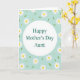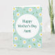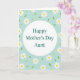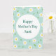 This greeting card features a soft pastel teal background filled with a repeating pattern of white, daisy-like flowers with sunny yellow centers, creating a gentle garden setting 🌼. In the middle, a crisp white oval sits like a spotlight, drawing your eye straight to the message. The words “Happy Mother’s Day Aunt” appear centered inside the oval in dark green serif lettering, clear and easy to read. Small green leaves and light yellow-green dots drift between the blossoms, adding a light, affectionate motion as if the flowers are leaning in close ❤️. The balanced mix of whites, greens, and yellows keeps the look calm and fresh, like a quiet spring morning. The floral border feels friendly and caring, framing the message the way family surrounds someone they love. Across the teal field, the white petals repeat evenly while the yellow centers and scattered dots create a soft, cheerful rhythm.