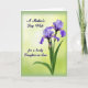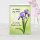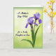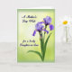 Designed with a serene floral arrangement, this Mother’s Day card features two purple, iris-like flowers opening on the right side, their ruffled petals shaded from deep lavender to soft periwinkle with small yellow centers. A closed bud sits just below them, tucked into long, narrow green leaves that lean upward like a gentle embrace. The background glows from a creamy yellow-green near the middle into a deeper green toward the edges, giving the scene a soft halo that feels quietly affectionate ❤️. In the upper left, the phrase “A Mother’s Day Wish” appears in a dark, flowing type style, spaced with plenty of breathing room against the light backdrop. Near the lower left, the line “for a lovely Daughter-in-Law” is set in the same dark lettering, balancing the flowers on the opposite side. Fine lines in the petals suggest delicate veins and texture, adding a tender, close-up intimacy to the blooms 🌼. The two blossoms face slightly outward while the bud angles up beneath them, all framed by the gentle green gradient.