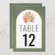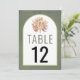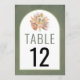 Tropical dried palm leaves, pampas grass and protea flowers green arch wedding table number. This pretty wedding design features an arch frame on green stained background. In the frame there is a bouquet of dried palm leaves, protea flowers and pampas grass.