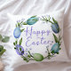 Throw pillow with soft watercolor blue, green and purple Easter egg and floral wreath with script letters Happy Easter. Coordinating back. View all of our decor in our Zazzle store!