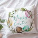 Throw pillow with soft watercolor taupe, pink and green Easter egg and floral wreath with script letters Happy Easter. Coordinating back. View all of our decor in our Zazzle store!