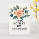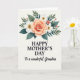 This greeting card features a watercolor-style bouquet at the top, arranged like a gentle crown that feels like a warm embrace ❤️. A large rose in soft peach and apricot sits at the center, surrounded by small white blossoms with golden-yellow stamens that add delicate detail. Deep emerald and muted teal leaves spread outward, with tiny pink flowers and a few deep red buds tucked in to suggest quiet affection. Below the flowers, the text “HAPPY MOTHER’S DAY” is centered in an all-caps serif font in a dark, easy-to-read color. Under that, “To a wonderful Grandma” appears in a flowing cursive-style font, slightly smaller and set in a coordinating dark tone that feels tender and close 🌼. The background is off-white, leaving plenty of open space so the bouquet and lettering feel airy and balanced. The floral cluster sits along the top edge, while both lines of text are stacked neatly in the middle-lower area with generous spacing.