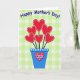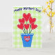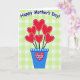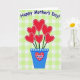 Designed with a bouquet of red heart shapes arranged like flowers in a bright blue planter, this card leans into a sweet, family-loving look ❤️. Six large hearts sit at the top, each edged with a dashed white outline that mimics stitched trim, making them feel cozy and cared for. Thin dark green stems rise from the pot, spaced neatly so the “flowers” look like they’re leaning in together like close friends. Along the planter’s rim, small white polka dots circle the top edge, adding a light, cheerful detail. Centered on the front of the pot is a smaller heart with a red-and-white check pattern, and the word “Aunt” appears across it in medium blue lettering. Across the upper area, “Happy Mother’s Day!” is placed in large blue text that arches slightly over the bouquet 🌼. Behind everything, a light green and white gingham pattern fills the background like a picnic cloth.