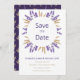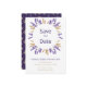 Nothing says romance like lavender, and on this fall save the date, the delicate blossoms make a soft frame for the text. Wheat is paired with the lavender to add a rustic flair to the design. A sans serif typeface is used for the headings for modern simplicity. On the back, a dark purple background contrasts with a white front. A wheat and lavender pattern also decorates the back. Get ready for your romantic fall wedding with this rustic lilac suite.