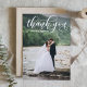 Elegant, stylish and whimsical vertical card to thank your guests for being a part of your wedding day. This customizable thank you postcard features white modern calligraphy overlay. This design is also available in other cards.