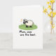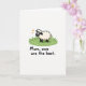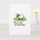 This card features a simple digital illustration on a white background, centered on a cute cartoon sheep standing on a textured patch of green grass. The sheep has fluffy cream-colored wool outlined in dark lines, with a black face and slim black legs, and its wide eyes have tiny highlights that give it a tender, friendly look ❤️. Two small golden starburst shapes float near its head, like gentle little compliments hovering in the air. Beneath the picture, the message “Mom, ewe are the best” sits centered in a casual hand-lettered style. The text appears in dark lettering that stands out clearly against the white space, keeping the layout easy to read. The pun adds a sweet, affectionate tone, like a quiet inside joke shared between parent and child 🌼. The green grass patch sits just under the sheep’s hooves, with the starbursts positioned slightly above and to the side of its head.