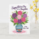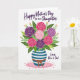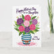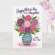 This card features a richly colored bouquet that feels like a warm hug, with stylized roses in fuchsia, soft pink, deep lavender, and purple nestled among leafy greens and tiny yellow and crimson buds ❤️. The flowers sit in a white vase with horizontal cerulean-blue stripes, giving the arrangement a tidy, cheerful structure. A brown ribbon wraps around the vase and ties into a neat bow, adding a sweet, caring touch that suggests someone took extra time for someone they adore. The background stays bright white, letting the colors stand close together like friends leaning in for a photo. Centered near the top, the message “Happy Mother’s Day to our Daughter” appears in a flowing, cursive-style font in a dark tone for easy reading. Near the lower right, “Love, Mom & Dad” is placed smaller to feel like a gentle sign-off, and a single 🌼 can be added nearby as a tiny accent. Beneath the vase, a soft pink oval base is dotted with scattered crimson spots like confetti.