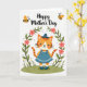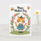 This card shows a sweet digital illustration of a ginger-striped cat standing upright with rosy cheeks and a gentle, bashful smile, as if sharing a quiet moment of affection ❤️. The cat wears a soft blue dress with a matching hat and little shoes, giving it a dressed-up, caring look that feels friendly and close. It stands on a green patch of grass sprinkled with small yellow flowers 🌼, like a tiny garden set aside for someone special. An arch of green vines curves around the character, dotted with soft pink blossoms and small gray accent dots that add a light, airy texture. Near the top, the words “Happy Mother’s Day” are placed in flowing dark lettering, centered above the arch. Two small striped insects hover near the upper corners beside the text, their yellow wings adding a hint of motion. The background stays bright white so the warm oranges, cool blues, fresh greens, and gentle pinks stand out clearly. The floral arch is made of looping green stems with pink blooms spaced evenly on both sides.
