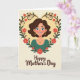 This card features an illustrated woman at the center, smiling with a gentle, affectionate look that feels like a warm hug ❤️. Her bright blue eyes glint softly, her cheeks carry a light blush, and her brown hair sweeps in loose waves around her face. She wears a teal top with small gold earrings and a matching pendant that add a simple, caring touch. Surrounding her is a heart-shaped wreath made of twisting brown vines and dark green leaves, suggesting tenderness through its protective shape. Red-orange flowers with sunny yellow centers dot the wreath, creating a cozy contrast against the creamy background inside the heart 🌼. Beneath the portrait, the words “Happy Mother’s Day” sit centered near the bottom in a flowing brown script-style font. The overall palette leans warm and gentle, with soft beige tones outside the heart and golden accents that keep the scene calm and inviting. The heart outline is formed by intertwined vines, with clusters of blossoms placed along the left and right curves.