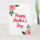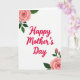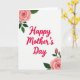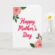 This greeting card features a bright white background with “Happy Mother’s Day” centered in lively fuchsia lettering, with smooth, flowing strokes that feel like a warm hug ❤️. The message sits as the main focal point, leaving plenty of open space around it so the words feel airy and cared for. In the upper left corner, a fully open blush-pink flower leans inward toward the text, as if gently admiring it, with deep green leaves spreading out beside a small closed bud. The soft shading on the petals adds depth without looking heavy, keeping the look calm and tender. In the lower right corner, a second generous pink bloom mirrors the first, angled back toward the center like a quiet back-and-forth between two friends 🌼. Two small buds rise on a slender stem near the lower bloom, adding a sense of new growth alongside the fuller petals. The leaves are a rich green with smooth edges and subtle texture, balancing the vivid fuchsia words. The upper-left blossom shows layered blush petals with a petite bud nestled among dark green leaves.