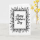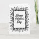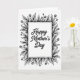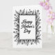 This card features a black-and-white design with a white rectangular panel centered inside a leafy floral border. In the middle panel, the words “Happy Mother’s Day” appear in dark, flowing lettering that feels gentle and affectionate ❤️. The text sits neatly centered, leaving open space around it so the message feels calm and cared for. Around the panel, curling leaves and thin stems lean toward each other like a soft embrace, with small budding flowers tucked between them 🌼. The botanical frame is drawn in dark ink with fine lines and light shading that adds depth without adding color. Some petals and leaves include tiny dot details that resemble soft shadows and give the border a textured, tender look. The border forms an even frame on all sides, with layered leaves and sprigs surrounding the bright center panel.