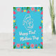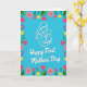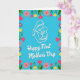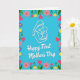 This greeting card features a bright blue background with a simple white line drawing of an adult gently cradling a baby, their heads angled close in a tender, caring pose ❤️. Around them, a floral border wraps the edges with fuchsia bell-shaped flowers, soft pink round blooms, and yellow tulip-like shapes nestled among rich green leaves. Small golden starburst accents are sprinkled between the flowers, adding a light twinkle that feels celebratory without being loud. The main message appears in white lettering near the center, arranged to sit close to the figures so the words feel connected to the embrace. Additional smaller white text is placed nearby, keeping the layout balanced and easy to read against the blue. Deep purple touches appear in the floral details, giving the frame extra depth and contrast 🌼. The overall composition keeps the figures uncluttered while the garden-like border creates a cozy, affectionate setting. The white outlines and text stand out sharply against the blue field, surrounded by fuchsia, pink, yellow, purple, and green botanicals with tiny gold bursts.