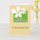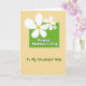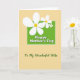 This card features a rich green rectangle near the top center, edged with a softly scalloped outline, setting a cozy, affectionate tone. Inside that panel, rounded white lettering reads “Happy Mother’s Day,” standing out clearly against the green. Three white flowers with gently curved petals and warm yellow centers tumble down over the panel, overlapping it like a small bouquet offered with a tender glance ❤️. The largest bloom sits on the left and stretches slightly past the edge, while two smaller blossoms cluster to the right for a friendly, balanced look. Behind everything, a pale yellow-beige background carries a faint crosshatch texture, like woven fabric, adding a calm, homey feel 🌼. Beneath the green panel, a flowing cursive line in deep green says “To my wonderful Mom,” placed centrally as a softer, more intimate note. The flowers’ stems and leaves are kept minimal, letting the white petals and yellow centers draw the eye first. The top panel sits in the upper half of the layout while the cursive line rests below it, both aligned along the center.