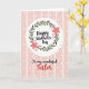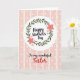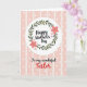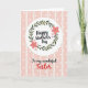 This greeting card features a white circular badge near the top, like a glowing spotlight for the main message. Inside the circle, curving lettering announces the occasion in a dark tone, framed by a leafy wreath that feels like a gentle embrace ❤️. The wreath mixes soft green leaves with coral-pink flowers and smaller pale pink blooms, and a tiny pink heart nestles among the petals to suggest closeness and care. Below the circle, a second line of text sits centered in the lower half in matching flowing lettering, with the final key word set in rich red to stand out. The overall background is a light pastel pink that keeps everything calm and affectionate. Vertical stripes alternate between slightly deeper and lighter pink bands, and each band is sprinkled with neat white polka dots 🌼. The top badge and wreath remain crisp against the striped field, with the white circle clearly separated from the patterned pink backdrop.
