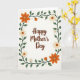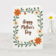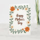 This greeting card features the words “Happy Mother’s Day” centered in warm chocolate-brown lettering, surrounded by a gentle ring of curling dark-green vines. The leafy stems sweep inward from the edges like an affectionate embrace, giving the layout a close, caring feel ❤️. Bright orange, many-petaled flowers with textured golden centers alternate with creamy white blooms, creating a soft back-and-forth that feels like a quiet conversation between loved ones. Small unopened buds sit near the outer border, adding little pauses of anticipation around the message. The text stays clear in the middle while the floral frame keeps the eye moving in a calm circle, like hands linked in support 🌼. An off-white background with faint beige polka dots keeps everything light and airy without stealing attention from the flowers. The orange blossoms, pale blooms, and dark-green vines form an organic border around the centered brown message on the dotted off-white backdrop.