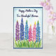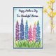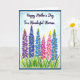 Designed with a tall, vertical layout, the card pairs a gentle message with a garden-like flourish that feels affectionate and close ❤️. Near the top, the words “Happy Mother’s Day To a Wonderful Woman” sit centered in flowing dark blue lettering against a softly blended sky-blue background that fades lighter toward the edges. The open, airy wash behind the text suggests a calm morning sky, giving the message room to breathe. Below the lettering, six tall flower spikes stand in a neat, balanced row, like companions leaning toward one another in quiet support 🌼. Each stalk rises from a bed of varied green blades, with blossoms shifting through deep violet, indigo, fuchsia, and bright blue for a lively contrast. A few spikes show small touches of sunny yellow near their tips, adding a bright accent that draws the eye upward. The paint texture looks like layered water-based strokes, with soft edges and visible brush marks across the blue background and the clustered blooms. At the bottom, the green grasses spread outward in short, tapered strokes beneath the six upright stalks.