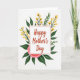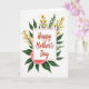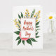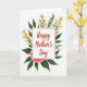 This greeting card features a white rectangular panel centered on the front, edged with a thin red border and surrounded by a garden-like arrangement that feels like a gentle hug ❤️. Inside the panel, the words “Happy Mother’s Day” sit prominently in warm red lettering, with the text centered and easy to read. Around it, deep green leaves spread outward like protective arms, creating a cozy, caring setting. Slender dark stems rise through the greenery, topped with small golden-yellow flowers that add a sunny, affectionate glow 🌼. Near the bottom, a large soft pink flower with layered petals anchors the design, suggesting a tender closeness through its rounded, gathered shape. The background stays bright white, letting the reds, greens, yellows, and pinks stand out without distraction. The central message remains framed in white with the red outline, while the foliage and blossoms fan out around it in a balanced oval shape. The biggest pink bloom sits at the lower center beneath the panel, with yellow flower clusters reaching upward on both sides.