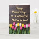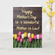 The front design shows a dark, textured wooden background that feels cozy and intimate, like a quiet room set up for a special visit. Across the upper portion, raised cream-colored lettering spells out a Mother’s Day message, with each letter casting a soft shadow for depth ❤️. The words are centered and stretch gently from left to right, standing out clearly against the deep brown wood. Along the lower third, a horizontal band of spring flowers adds a sweet, affectionate touch, like a bouquet offered with a tender smile 🌼. The blooms resemble tulips in soft white, sunny yellow, and rich pink, their petals open and slightly curved as if leaning toward one another. Green stems and broad leaves form a lush base, and a few petals show tiny water droplets that catch the light. The contrast between the pale text and the dark wood keeps the message easy to read while the flowers bring warmth and closeness. The pink blossoms cluster more densely near the center, with lighter flowers tapering toward the edges.