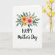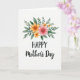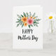 Designed with a soft watercolor look, the card features a floral arrangement crowning the top of a bright white background. Large multi-petaled blooms in salmon pink and tangerine sit close together like companions leaning in, with deeper yellow tucked into their centers. Smaller sunny yellow flowers sprinkle around them, adding a gentle, friendly energy 🌼. Layers of green foliage in olive and emerald spread outward in light, airy shapes, as if the bouquet is reaching out for a hug ❤️. Centered beneath the flowers, the word “HAPPY” appears in uppercase sans-serif lettering, set in deep black. Immediately after it, “Mother’s Day” flows in a connected cursive style in the same black, with both lines placed below the bouquet and above the open white space. The brushy edges and slight paint variations are visible in the petals and leaves, especially along the outer tips of the greenery.