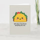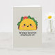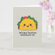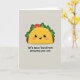 This card features a cute, human-like taco character centered on the front, drawn with simple shapes that make it feel friendly and approachable ❤️. The shell is a warm golden yellow, cradling bright green lettuce-like frills and a small red circle that reads like a fresh topping. Its face has big black eyes, a small curved smile with one tiny white tooth, and soft pink blush on the cheeks, giving it a sweet, affectionate look as if it’s sharing a private joke with you. The background is a calm light greige, keeping the focus on the character while setting a cozy, relaxed mood. On both sides, faint pale-pink starburst shapes hover like gentle sparkles, adding a soft touch of charm 🌼. Beneath the character, a short pun-style message sits centered in thick, dark lettering that stands out clearly against the light background. The text is placed low on the design, leaving plenty of open space around the smiling taco above it. Two pale-pink starbursts sit to the left and right of the taco against the light greige backdrop.
